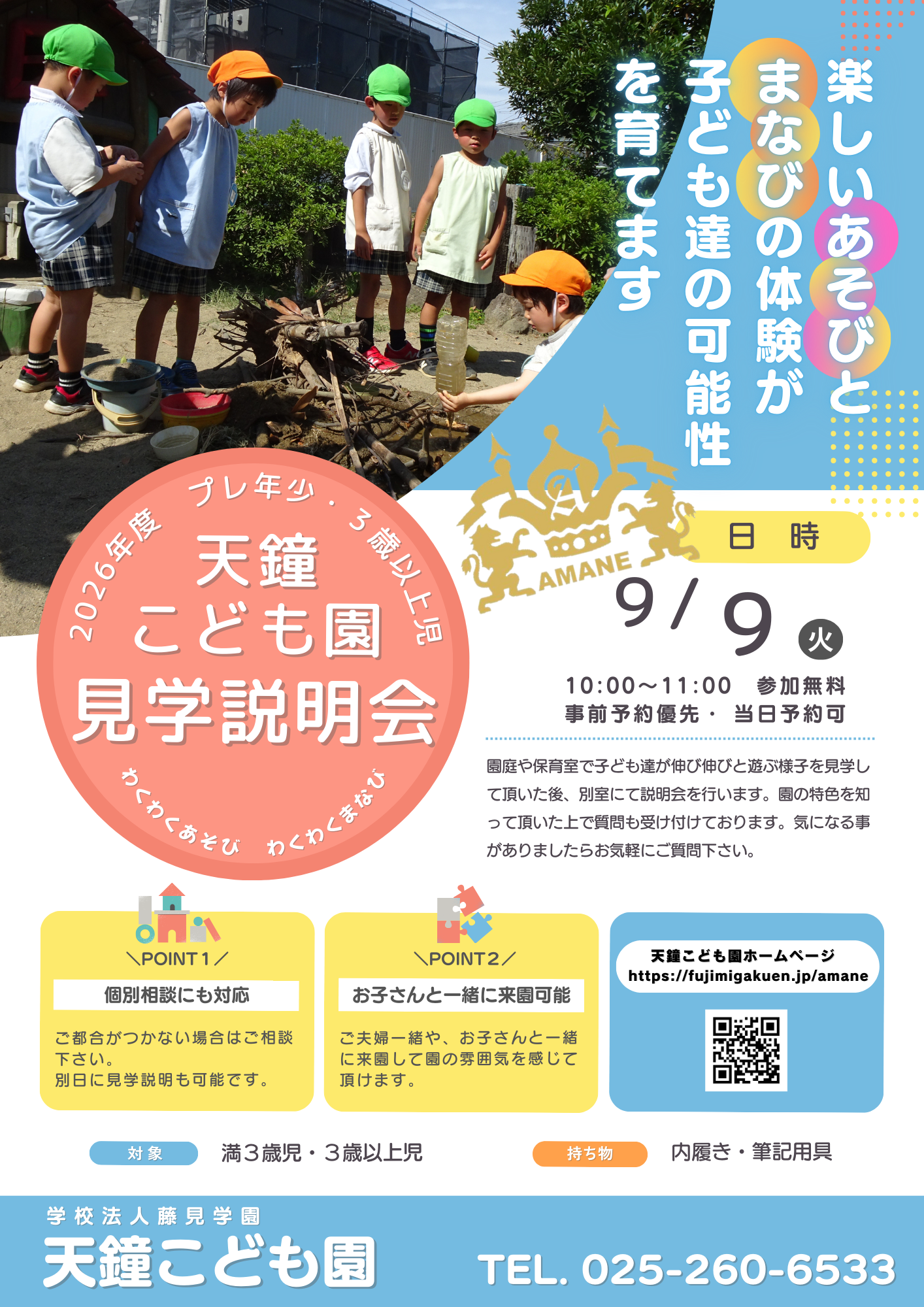 保育料について・・・国により無償化になります。(その他以下の経費がかかります。) 1号認定こども給食費 6,300円、教材費 2,600円、維持費 1,200円の実費を徴収致します。(預かり保育利用者は別途料金がかかります) 2号認定こども給食費 8,700円、教材費 2,600円、維持費 1,200円、おやつ代1,000円の実費を徴収致します。 新2号認定こども給食費 6,300円、教材費 2,600円、維持費 1,200円、おやつ代1食50円の実費を徴収致します。 新3号認定こども満三歳における住民税非課税世帯以下の方が対象となります。詳しくは園までお問い合わせください。 |