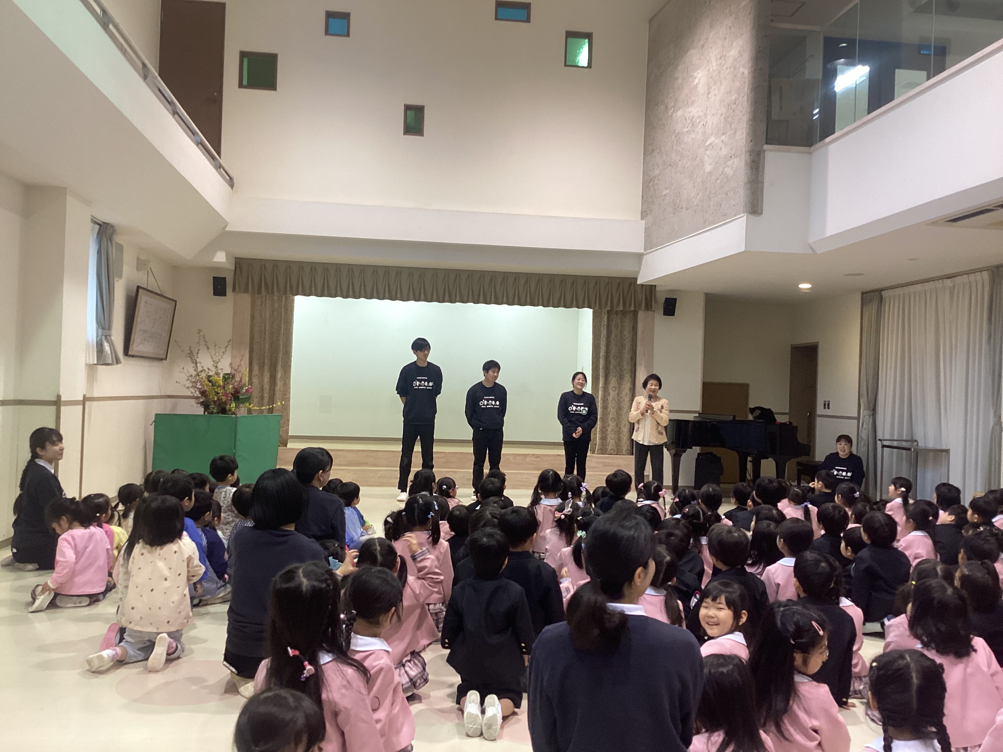 年少・年中組が飾り付けた素敵なホールでお互いに歌のプレゼントや年長さんから手作り玩具をもらいました!