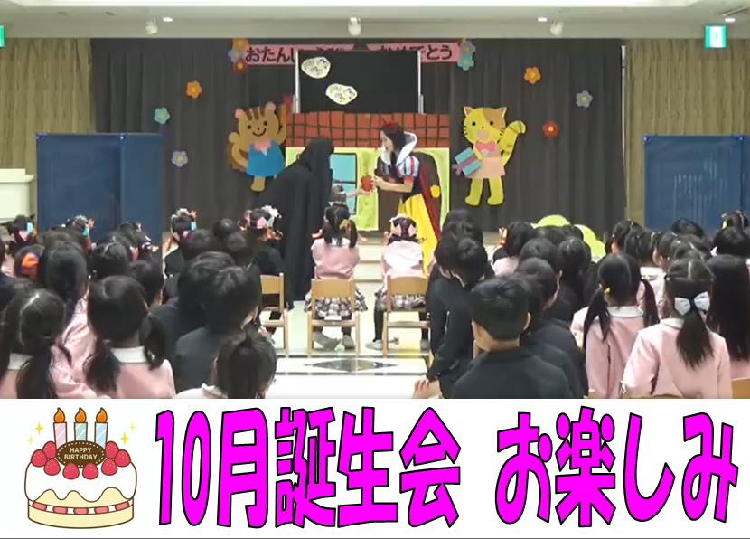 10月生まれのお誕生会がありました。 子どもたちはインタビューコーナーでウキウキ・ドキドキな表情でした。 ステージでダンスを披露したり、職員のお楽しみでは【 白雪姫 】を 喜んで見ていました。