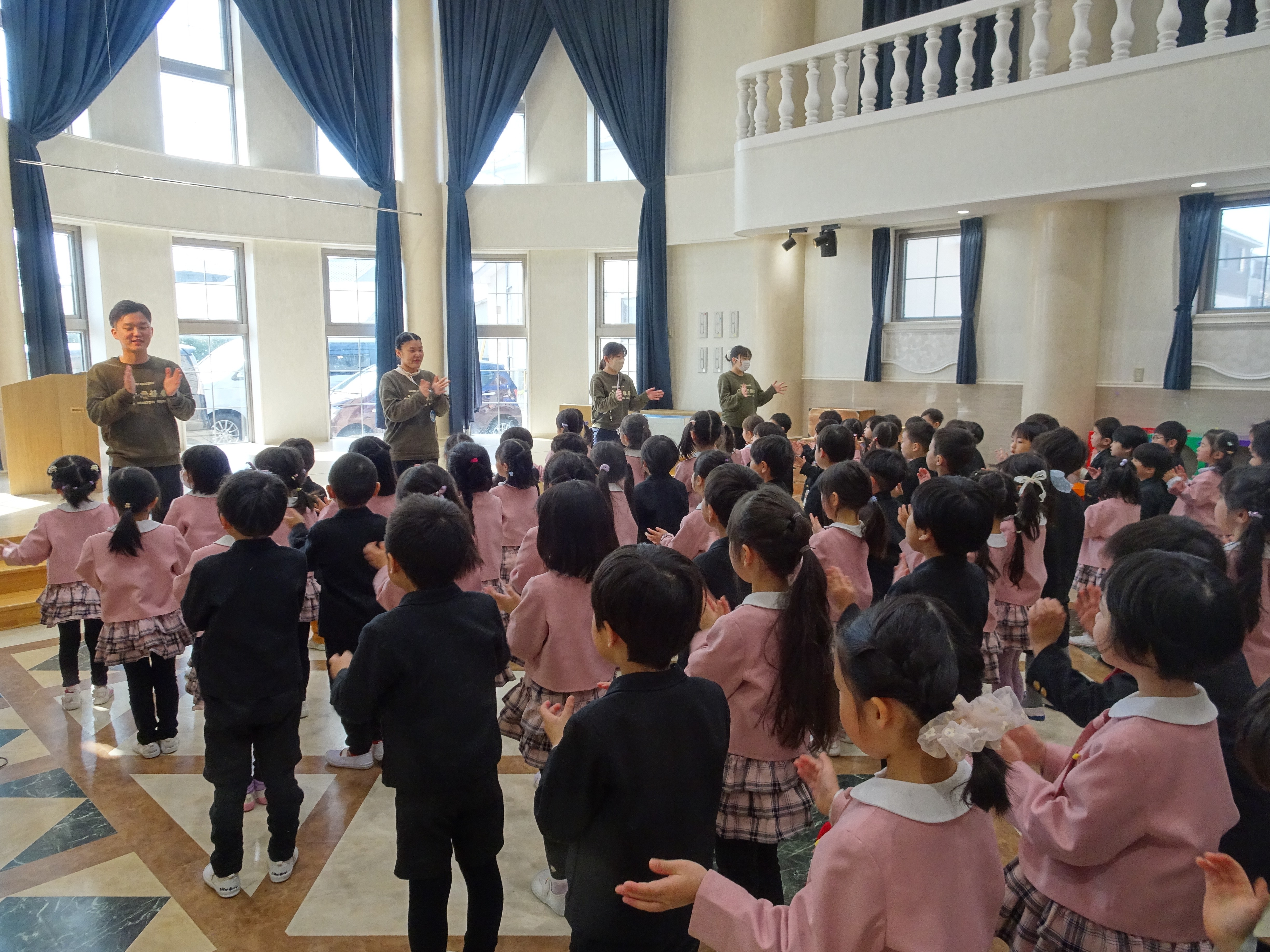 年少・年中組が飾り付けた素敵なホールでお互いに歌のプレゼントや年長さんから手作り玩具をもらいました!