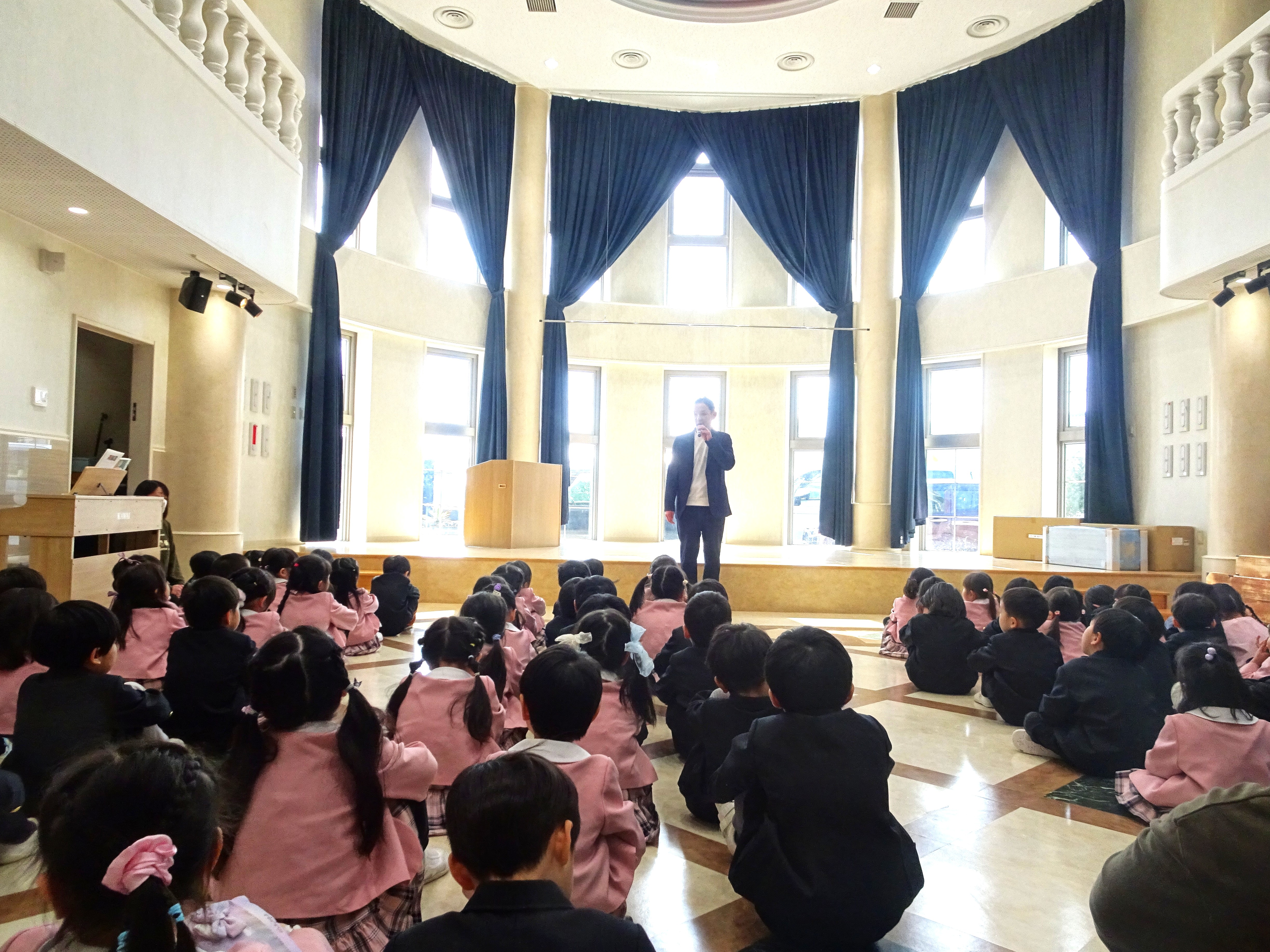 今日は、3学期終業式でした。園長先生から「1年間いろいろなことを頑張りました‼4月からも楽しんでいって下さい‼」とお話がありました。