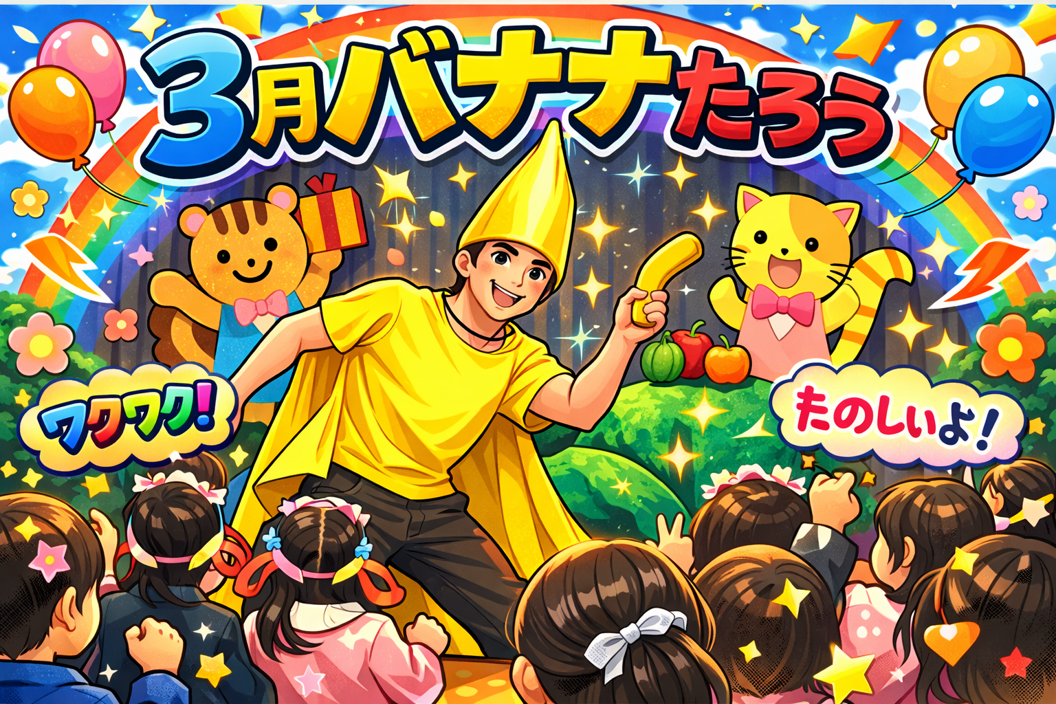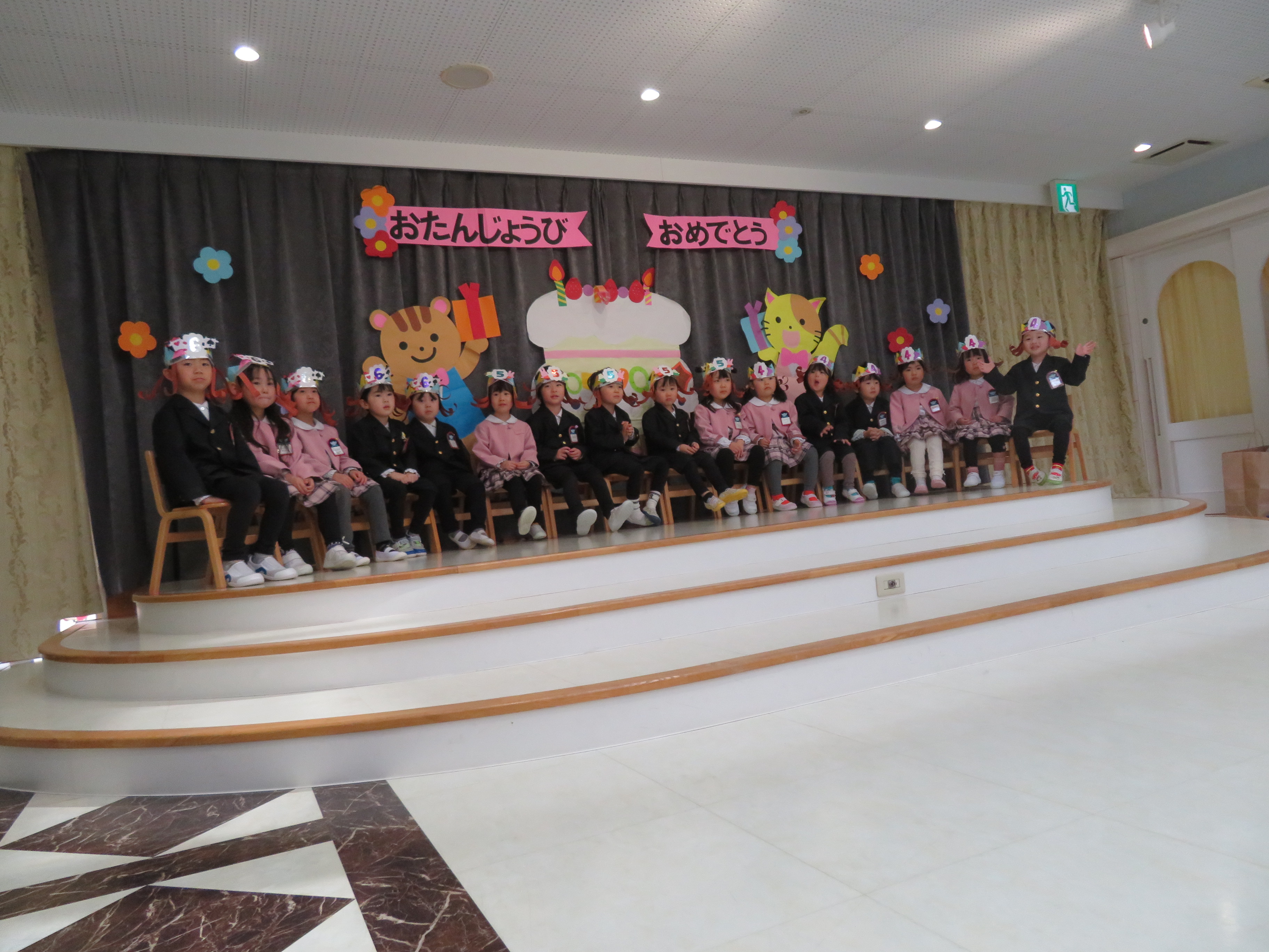 3月生まれのお誕生会がありました。 子どもたちはインタビューコーナーでウキウキ・ドキドキな表情でした。 ステージでダンスを披露したり、職員のお楽しみでは【バナナたろうと魔法のバナナ】を喜んで見ていました。