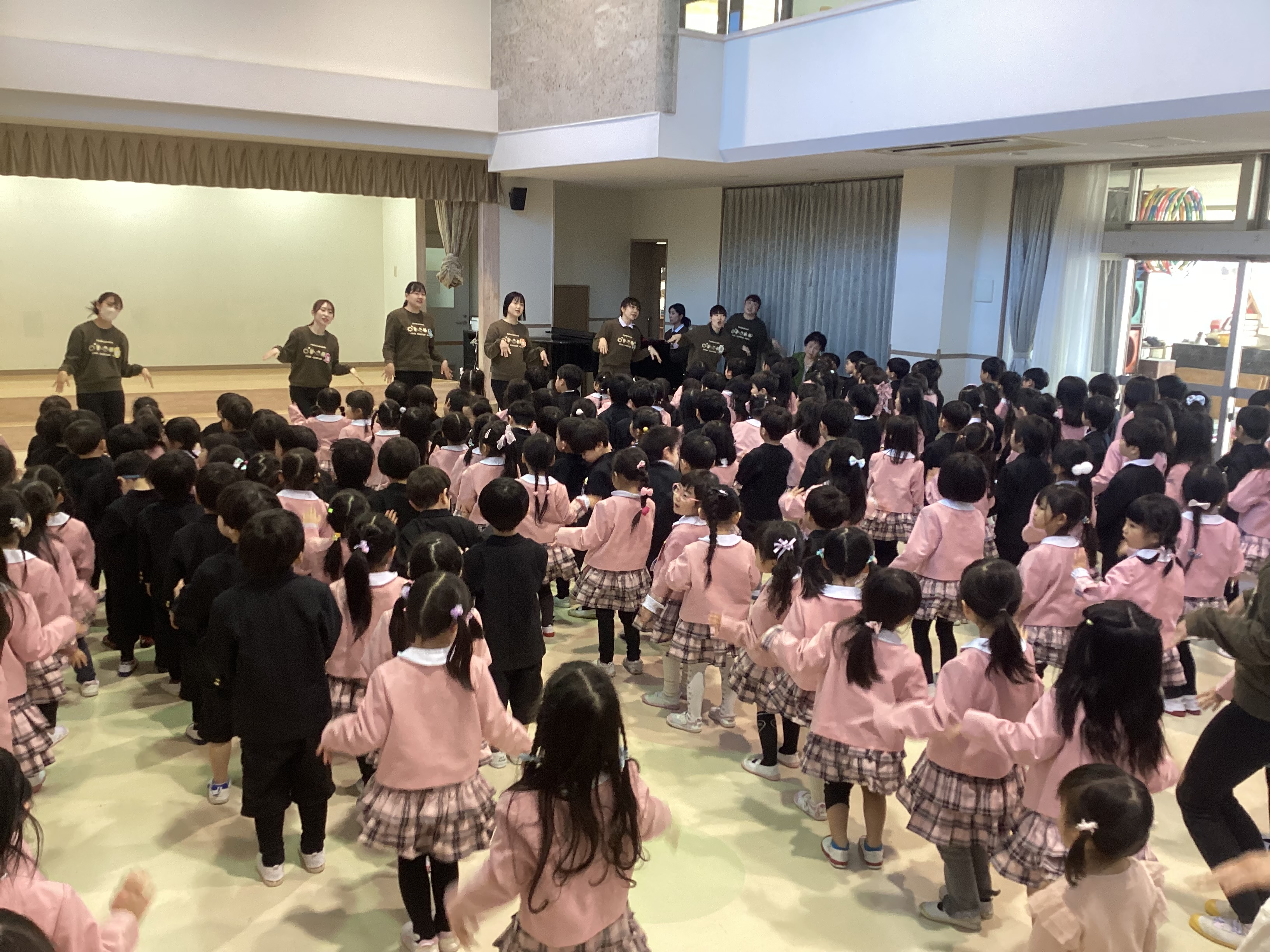 年少、年中組さんは年長組さんに感謝の気持ちを込めて踊り・歌・言葉のプレゼントをしました。