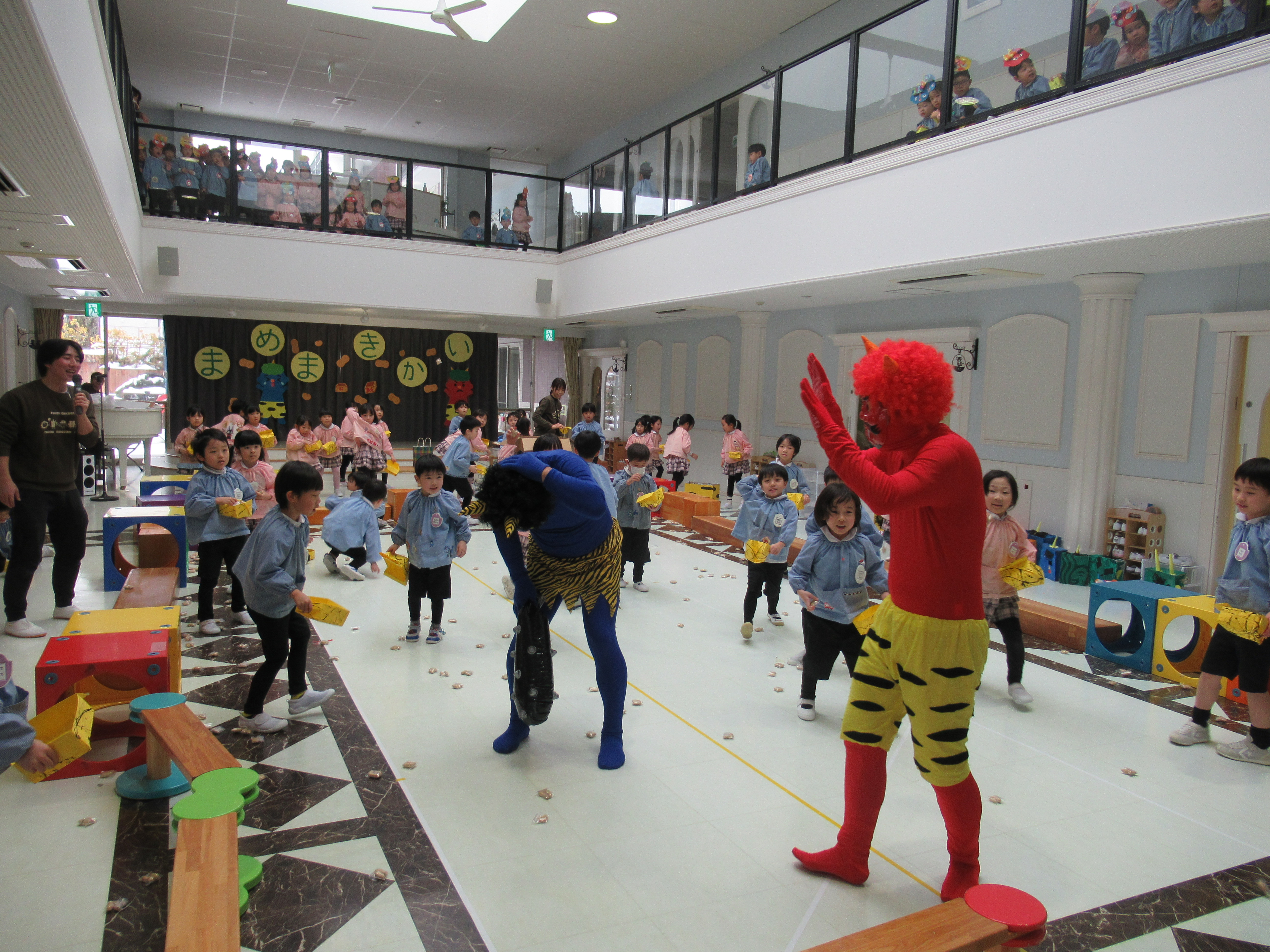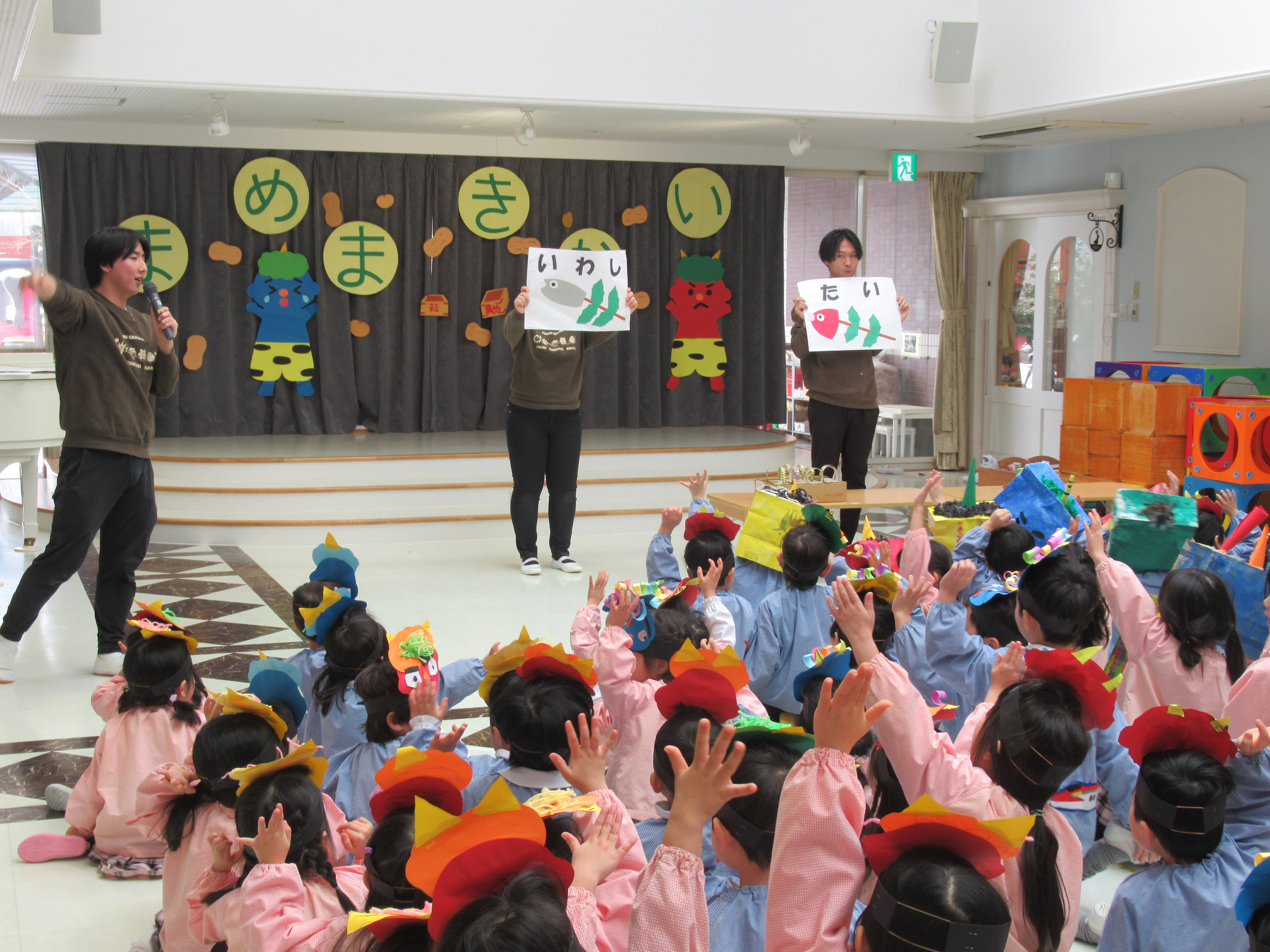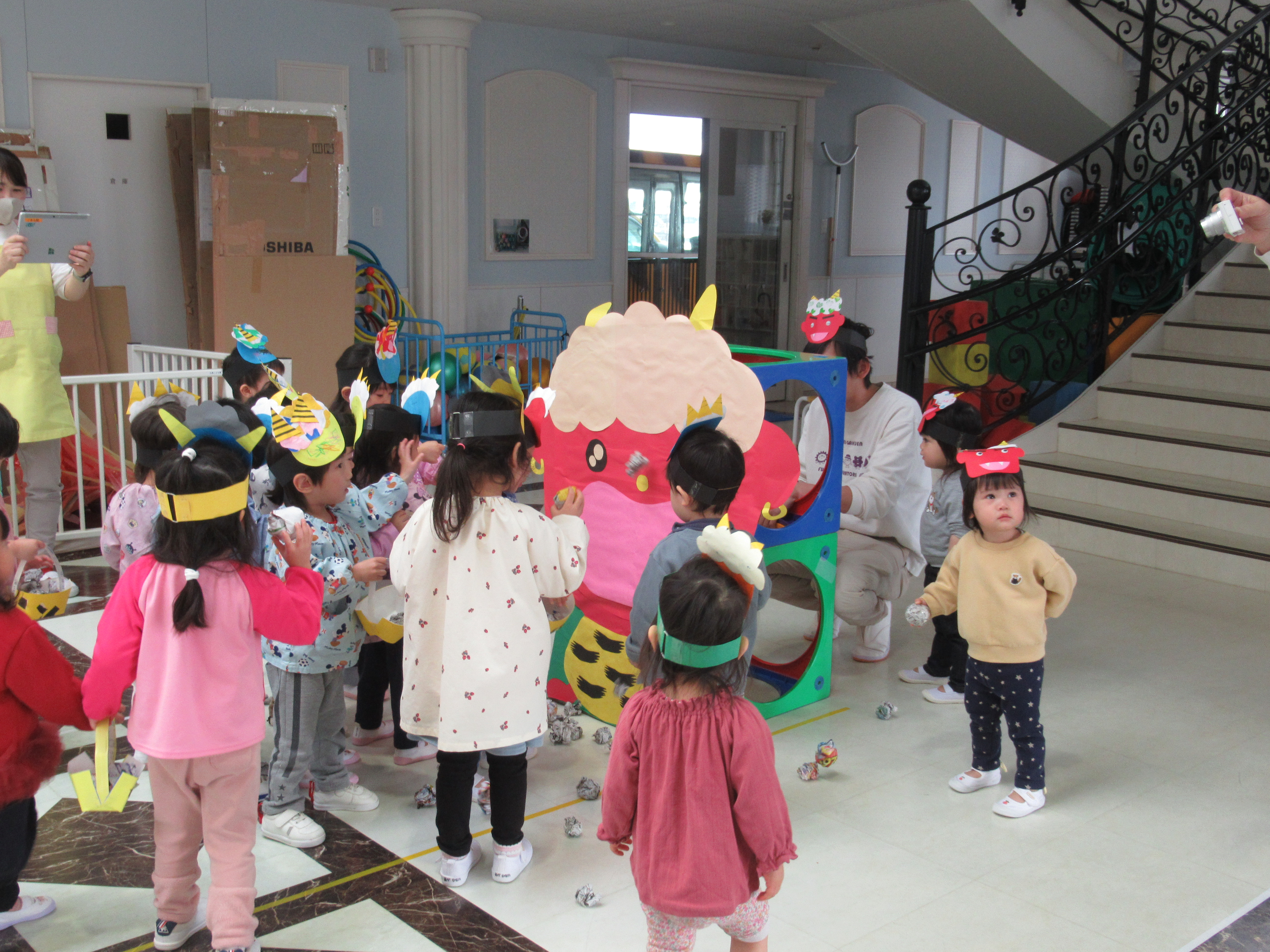 自分で作った鬼のお面をかぶり豆まき会に参加しました。各クラス交代で鬼役と豆を投げる役で会を楽しみました! お腹の中にいる鬼は、無事に退治できたかな♪